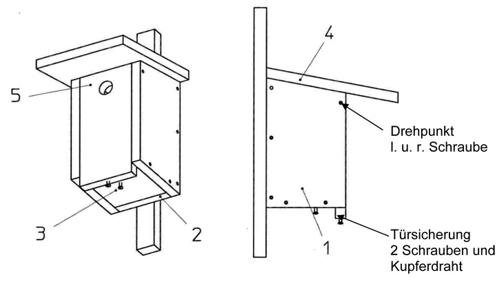 Zuschnitt Ausgehend von 20 mm Brettstärke. Die Teile nach den vorgegebenen Maßen zuschneiden und gleich kennzeichnen. Zusammenbau Wird der Kasten mit wasserfesten Holzleim und rostfreien Spax zusammengebaut und erhält er außen einen Anstrich mit Leinöl- Firmisgemisch 1:1, das Dach mit Teerpappe oder Blech abgedeckt so hält der Kasten mindestens 20 Jahre. Eine Einfluglochverlängerung, ein Blech auf dem Dach verhindert weitgehends die Nesträuberei. Eine Aufsitzstange erleichtert sie.
